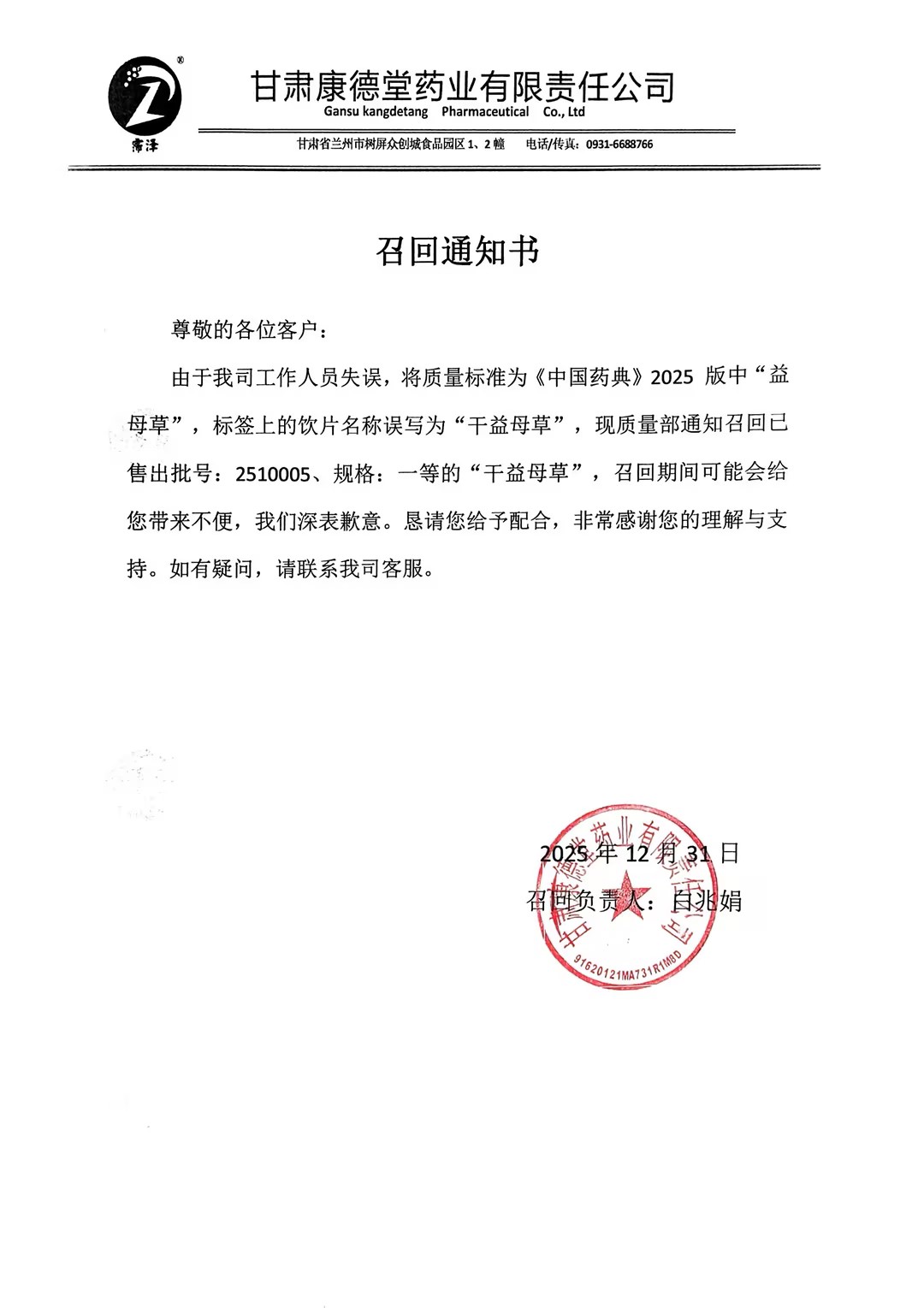 甘肃康德堂药业有限责任公司
